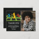Carte de remerciement d'anniversaire trampoline avec un fond noir uni, une photo adorable de votre enfant, des terrains de trampoline, des enfants qui sautent et volent dans les airs, et un modèle de remerciement personnalisé moderne facile à personnaliser.