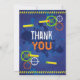 Une carte de remerciement amusante inspirée des Guerres "Nerf" pour la prochaine fête de bataille de guerre de fléchettes de votre enfant ! Avec des fléchettes qui volent et un soldat tenant un lanceur. L'avant et l'arrière de cette carte sauront impressionner vos invités. L'invitation assortie est disponible en magasin. Conçue par www.invitecentral.com