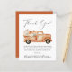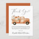 Carte de remerciement élégante et abordable pour votre baby shower avec "Merci" dans un script élégant avec un flourish de cœur et des aquarelles d'un camion vintage transportant des citrouilles orange et crème et des bouquets floraux. Personnalisez votre message de remerciement dans une typographie moderne simple et ajoutez vos noms dans un script ressemblant à une signature.