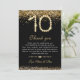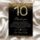 Célébrez une décennie d'amour et d'engagement avec cette élégante carte de remerciement pour les 10 ans de mariage. Avec un fond noir dramatique associé à un motif luxueux en or et diamant « 10 », cette carte capture la beauté intemporelle et la brillance d'un anniversaire de diamant. La palette de couleurs noire et or raffinée ajoute une touche de sophistication, ce qui en fait le moyen idéal pour exprimer votre gratitude après votre célébration de cet événement marquant.