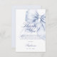 Cette carte élégante présente un charmant nœud bleu parfait pour une douche de mariage "quelque chose de bleu". Conçue dans des aquarelles pastel douces, elle combine un script manuscrit romantique avec des éléments fantaisistes tendance. Idéal pour une douche de mariage bleu poussiéreux.