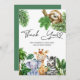 Exprimez votre gratitude avec style grâce à cette charmante carte de remerciement sur le thème du safari. Avec un paresseux joueur, une girafe adorable, un zèbre et un éléphant entourés de verdure tropicale luxuriante, cette carte est le moyen idéal de remercier vos invités d'avoir rendu votre baby shower encore plus spécial. La police de caractères manuscrite élégante ajoute une touche sincère à ce design charmant.