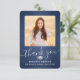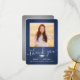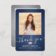 Envoyez une note de gratitude élégante avec 2 cartes de remerciement personnalisées bleu marine, argent et blanc. Toutes les images et le libellé sont simples à personnaliser. (CONSEIL EN MATIÈRE DE PLACEMENT D'IMAGE : Une façon simple de centrer une photo exactement comment vous voulez est de la rogner avant de la télécharger sur le site Zazzle.) Ce modèle peut être customisé avec n'importe quel libellé de votre choix comme les plans d'études futurs, le nouveau poste ou la citation inspirante préférée. Si vous préférez écrire votre message à la main, supprimez simplement le texte de l'exemple ou utilisez l'espace au-dessus de la nouvelle adresse et des informations de contact. Le design comprend un arrière - plan en acier inoxydable brossé bleu foncé, un casquette en carton de faux papier, une calligraphie manuscrite, une typographie minimaliste moderne et deux photos de votre choix, telles que des images de haut niveau ou des images de la cérémonie de début. Veuillez noter que l'argent est imprimé en couleur et non en papier métallique. Ces élégantes cartes personnalisées sont une façon tendance et chic de remercier la famille et les amis pour partager votre célébration de remise des diplômes. Félicitations au diplômé !