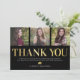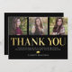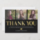 Cartes de remerciement de fin d'études modernes avec un fond noir élégant qui peut être changé en n'importe quelle couleur, 3 photos du diplômé, les mots "merci" dans une police dorée formelle, un mot de remerciement, et le nom du diplômé.