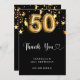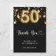 Un carte de remerciements pour un 50ème anniversaire. Une couleur noire arrière - plan. Avec des étoiles en faux or. À l'avant : numéro 50 écrit avec une police de style ballon. Merci, votre texte, votre titre et une date. Retour : Personnalisez et ajoutez Votre note de remerciement et votre nom.