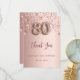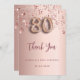 Un carte de remerciements pour un 80ème anniversaire. Couleur arrière - plan rose or dégradé. Avec de l'or rose gouttant des étoiles brillantes. A l'avant : numéro 80 écrit avec une police de style ballon, grand rose foncé écriture manuscrite couleur or et le texte : Merci, votre texte, titre et une date. Retour : Personnalisez et ajoutez Votre note de remerciement et votre nom.