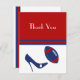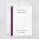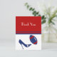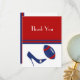 Grand carte de remerciements mariage à thème football fait sur stock à carte plate. Les graphiques d'un talon bleu haut qui donne un pied à un football rouge, blanc et bleu, décorent le front inférieur, avec le dessus solide rouge, avec deux bandes bleues, et le texte blanc lecture Merci. Le dos est blanc, avec des rayures rouges et bleues sur le côté gauche de la carte. Le texte bleu est prêt à être personnalisé selon vos besoins. Grand ajout à nos produits patriotiques mariages à thème de football rouge, blanc et bleu.