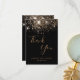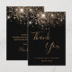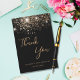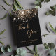 Une carte de remerciement pour un 50e anniversaire (ou tout âge). Un fond de couleur noire, orné de fausses paillettes dorées. Sur la face avant, un grand texte manuscrit de couleur dorée foncée et le texte : Merci, votre texte, titre et une date.