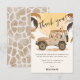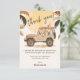 Vous cherchez la carte parfaite pour remercier vos invités d'être venus à la fête d'anniversaire de votre petit ? Ne cherchez pas plus loin que nos adorables cartes de remerciement sur le thème du safari, représentant un camion de safari rempli de toutes sortes d'animaux de safari, y compris un lion conduisant le camion, un léopard, un suricate, une girafe, un éléphant et un zèbre. La carte de remerciement comporte également un énorme soleil en arrière-plan et des feuilles tropicales dans des tons safari terreux de beige et de brun neutres.