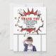 Carte de remerciement d'anniversaire avec bulle de texte de bande dessinée de super-héros pour garçons. Ajoutez votre message et votre nom. Carte de remerciement d'anniversaire de dessin animé amusant pour garçons.