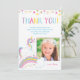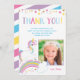 Carte de remerciement photo d'anniversaire licorne mignonne. Ce design amusant présente une illustration de licorne douce, des étoiles et un arc-en-ciel. Couleurs tendance rose, violet, bleu et jaune avec une touche de paillettes dorées fausses. PHOTO D'EXEMPLE DE FILLETTE NON INCLUSE. REMPLACER AVEC VOTRE PROPRE PHOTO AVANT DE COMMANDER.