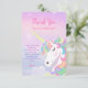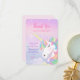 Illustration de licorne arc-en-ciel pastel avec un fond de lavis d'aquarelle et une illustration de nuage délicat. Cette mise en page fantaisiste de conte de fées présente une typographie élégante et des teintes pastel rêveuses, parfaites pour une célébration d'anniversaire de fille magique.
