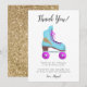 Carte de remerciements pour un anniversaire amusant sur le thème des patins à roulettes rétro. On y voit une illustration dessinée à la main d'un patin à roulettes de couleur rose et bleue avec une forme d'éclair doré pailleté faux imprimé dessus. Dans le message par défaut, il est écrit "merci d'être passé". Vous pouvez personnaliser ce produit en ajoutant le nom de votre enfant.