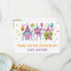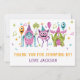 Une carte de remerciement de petit monstre amusante et mignonne avec trois monstres drôles de couleurs vives avec des visages drôles et des yeux globuleux profitant d'une fête d'anniversaire de monstre mash. Vous pouvez personnaliser le texte. Il y a un espace vide au dos de la carte au cas où vous voudriez ajouter une note manuscrite. Voir toute la collection de fête assortie !