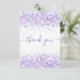 Un carte de remerciements d'anniversaire féminin et élégant. Un arrière - plan blanc chic. Avec de la poussière de parties scintillant violette et imitation. Sur l'avant grand main écriture et le texte : Merci. Retour : Personnalisez et ajoutez Votre note de remerciement et votre nom. Le nom est écrit avec un script de style moderne écrit à la main avec des swashes.