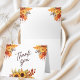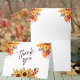 La note de remerciement de l'automne comprend des fleurs de cascade, des tournesols, des feuilles d'automne et des baies aux teintes orange, rouge et jaune. Le Merci de script affiché à l'avant dans une couleur de police pour correspondre aux illustrations. Les bordures de flûtes sont répétées sur le dessus à l'intérieur et le bas à l'intérieur volontairement laissés vides pour fournir de l'espace pour une note personnelle. Disponible en deux tailles.