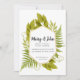 Faire-part de mariage moderne et élégante avec fougères vert aquarelle et feuilles eucalyptus avec cadre doré. Image botanique.