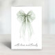 Élégante carte de remerciement pliée pour arrosoir de mariage avec une belle illustration aquarelle d'un noeud coquet vert sauge et "avec amour et remerciements" dans un script chic. À l'intérieur, personnalisez votre message et ajoutez votre nom dans un script ressemblant à une signature, ou laissez en blanc pour des notes manuscrites.