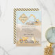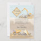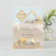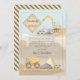 Créée avec une aquarelle muette moins palette traditionnelle, cette conception de Baby shower "Merci" comprend un camion à benne et une pelle-pelle sur un chantier de construction. La palette muette se poursuit sur le dos avec un motif rayé gris fusain et jaune plus doux.