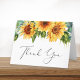 Carte de remerciement pliée pour baby shower de mariage rustique. Le devant présente des bouquets aquarelles de fleurs de tournesol et de verdure d'eucalyptus et "Merci" dans un script calligraphique élégant. À l'intérieur, personnalisez votre message de remerciement et ajoutez votre nom dans un script ressemblant à une signature, ou laissez en blanc pour une note manuscrite.