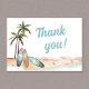 Un beau carte de remerciements de surf d'été pour vos invités de baby shower avec une illustration aquarelle d'une scène de plage tropicale avec palmiers, rivages sablonneux, étoiles de mer et planches de surf, et "Merci !" présenté dans un script bleu rétro amusant. Au verso, customisez votre message de remerciement ou laissez une note manuscrite en blanc.