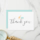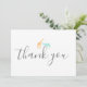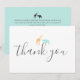 La carte de remerciement de baby shower magnifiquement conçue mettant en vedette une girafe orange aquarelle et un éléphant bleu. La typographie moderne et script est utilisée. Au dos de la carte est bleu mer uni avec message personnalisable ou supprimer le texte pour les messages manuscrits.