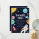 Carte de modèle de baby shower à thème spatial mignonne avec l'art de la crayon des planètes, fusée, astronaute, OVNI, étoiles dans la galaxie. La carte a un message qui remercie les invités d'avoir assisté à la douche et pour le cadeau. Idéal pour un baby shower garçon.