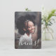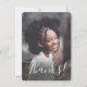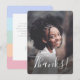 Cette carte de remerciement photo simple et mignonne présente une photo en pleine page sur le devant, avec un texte élégant qui dit "Merci !". Le dos de la carte comporte un motif à rayures pastel arc-en-ciel en violet pérywinkle, bleu aqua, vert menthe, pêche corail et rose clair. Des modèles de texte sont inclus au dos pour la personnalisation. Parfait pour envoyer après une fête d'anniversaire pour une préadolescente ou une adolescente ! Pour des demandes de conception personnalisée ou de produit, veuillez me contacter (Tracey) à orabellaprints@outlook.com.