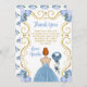This birthday thank you card features an elegant gold frame, a beautiful princess with red hair and a dusty blue dress, flowers and a balloon.
