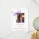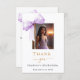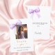 A modern and elegant birthday "all ages" thank you card. A white colored background, decorated with a large lavender colored bow. Black and golden letters. On the front the text: Thank You, name, and a date. Add a photo.