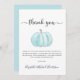 Merci à votre bébé garçon douche les invités avec cette carte de remerciements mignonne avec "merci" dans un script gris élégant avec des swashes et une aquarelle bleue de citrouille. En dessous, vous pouvez facilement personnaliser votre message de remerciement ou laisser vide pour une note manuscrite, et ajouter une signature.