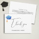 Carte de remerciements de graduation manuscrite moderne et élégant avec une illustration d'une casquette de graduation en bleu royal et or, parfait pour les diplômes du secondaire et du collège. Ajoutez votre message au dos de la carte pour personnaliser davantage. Illustré et dessiné par Patricia Alvarez.