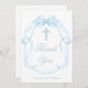 Un arc bleu élégant entoure vos cartes de remerciement chic pour la fête de votre petit garçon. Une belle croix chrétienne est au-dessus du script personnalisé pour votre célébration de confirmation ou baptême. Belles cartes à ruban religieuses pour votre cérémonie catholique.