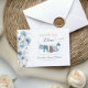 Inspired by a peaceful meadow of soft blue wildflowers, this “Baby in Bloom” thank you card brings a gentle botanical charm to your celebration. The sweet baby clothesline illustration and watercolor florals create a heartfelt way to thank guests for sharing in your special day.