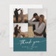 Ce carte de remerciements de collage photo de mariage turquoise et chic boho est parfait pour un mariage minimaliste. La tonalité audacieuse turquoise de bijou moderne design bohème dispose de calligraphie rustique simple avec un style unique mais classique. Personnalisez la carte avec trois photos de votre jour de mariage, vos noms et votre date de mariage. Supprimez l'exemple de texte au verso de la carte pour pouvoir écrire une note réfléchie à chaque invité, ou faire imprimer un message.
