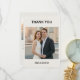 Thank your wedding guests with this modern photo thank you card. White background with bold black "THANK YOU" at top and your wedding photo in the center. Back has a pre-printed message thanking guests for celebrating your day. Customizable with your photo and names. For couples who want a clean, minimalist way to send thanks after the wedding.