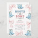 Kick Up some Fun - C’est une révélation de genre! Célébrez le moment excitant avec notre charmant Boots or Bows Gender Reveal Invitation Card. Dotée d’un thème occidental ludique, cette invitation capte le suspense et la joie de découvrir si c’est des bottes pour un garçon ou des arcs pour une fille. Avec des éléments rustiques et des détails mignons, c’est la façon idéale de faire découvrir à vos proches invitations. Personnalisable avec les détails de votre événement, cette carte est idéale pour des fêtes de style champêtre, des barbecues jardins ou des fêtes confortables à la maison. Imprimé sur un carton de haute qualité aux couleurs vives, c'est un souvenir que vos invités apprécieront. Caractéristiques du produit : -Texte entièrement personnalisable -Disponible en plusieurs types et tailles de papier -Design Occidental bleu et rose avec graphismes de démarrage et d'arc -Parfait pour toute soirée révélatrice de genre Préparez-vous à vous ressourcer - le grand dévoilement n'est qu'une carte!