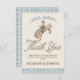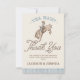 Sweet boy's brown and blue gray first rodeo themed thank you card featuring a cowboy and horse, rope style text heading and and buffalo plaid or gingham pattern.
