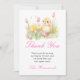 Jolie carte de remerciement pour brunch de Pâques avec un poussin adorable et des tulipes roses et jaunes. Les mots peuvent être modifiés pour s'adapter à vos propres détails ou exigences