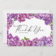 Envoyez vos remerciements avec cette carte de remerciement personnalisable. Elle présente des fleurs de lilas à l'aquarelle avec une calligraphie fantaisiste. Personnalisez-la en ajoutant vos détails. Cette carte de remerciement florale est parfaite pour un usage personnel et professionnel.