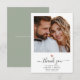 Cette carte de remerciement à cœur en rose gold imprimée moderne et chic comporte une calligraphie manuscrite à côté de vos noms dans une typographie serif élégante sous votre photo de mariage préférée. C'est la version vert sauge poussiéreux et blanc.