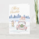 Carte de Noël avec un camion rouge coincé dans la neige avec une femme de neige et des arbres. Personnalisez votre message à l'intérieur de la carte.
