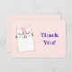 Un carte de remerciements avec l'illustration d'un mignon chaton endormi. Les yeux fermés ont l'air heureux et paisible. Sur un arrière - plan rose pâle. Le message sur le dos peut être customisé comme vous voulez. De plus, le dos de la carte a une illustration d'un chat qui agite en noir et blanc.