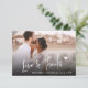 Elegant two-photo wedding thank you card featuring modern script lettering and a soft, romantic feel. The front displays a full-bleed photo with white “Love and Thanks” calligraphy and a delicate heart accent. The reverse side offers room for an additional photo and a personal message. Fully customizable and simple to personalize, this timeless thank you card is perfect for couples who love understated romance and clean, modern style.