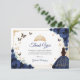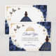 Navy, gold and white Quinceanera thank you card. Features brunette girl in ball gown dress, script font, gold butterflies, roses and tiara. Perfect for an elegant princess style glam celebration. Personalize with your own details.