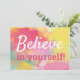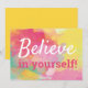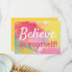 Citation joyeuse, motivante et inspirante : "Croyez en vous !" Il s'agit d'une carte avec des mots de sagesse à appliquer au quotidien. Le design présente un fond floral abstrait et coloré à l'aquarelle dans des tons pastel de rose, jaune et turquoise. Le dos de la carte est d'un jaune doré assorti. Les polices sont dans un rose et un blanc assortis. Les couleurs des deux polices peuvent être facilement personnalisées dans la section outil de conception de Zazzle. D'autres designs sont disponibles.