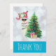 Carte de remerciements de Noël avec une drôle d'illustration. Un mignon lama portant des lunettes de soleil noires et un chapeau de santa rouge. Derrière un sapin de Noël avec des cadeaux festifs. Le mot Joy écrit au-dessus de sa tête dans une police de vacances colorée. Arrière - plan de bokeh en argent avec une bordure bleue glacée. Design fantasque et amusant à thème de Noël.