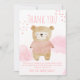Cet adorable carte de remerciements en baby shower présente une douce aquarelle illustrant un ours en peluche endormi, vêtu d'un doux pull rose, niché au milieu de nuages pastel moelleux et de coeurs roses délicats. Le design charmant allie charme boisé et couleurs douces et apaisantes, saisissant parfaitement la chaleur et la joie d'accueillir une petite fille. Le texte amusant "Merci" en rose assorti apporte une touche élégante et chaleureuse, ce qui en fait le moyen idéal pour express de gratitude à vos amis et votre famille après votre célébration spéciale.