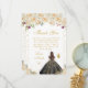 This elegant and glamorous sweet sixteen thank you card features a beautiful princess with brunette hair and fair skin in a black ball gown. The text combines handwritten script and modern sans serif fonts for a classy and sophisticated look. The floral arrangements, butterflies and gold confetti create the perfect blend of rustic and chic.