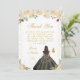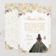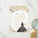 This elegant and glamorous birthday thank you card features a beautiful princess with dark hair and dark skin in a black ball gown. The text combines handwritten script and modern sans serif fonts for a classy and sophisticated look. The floral arrangements, butterflies and gold confetti create the perfect blend of rustic and chic.